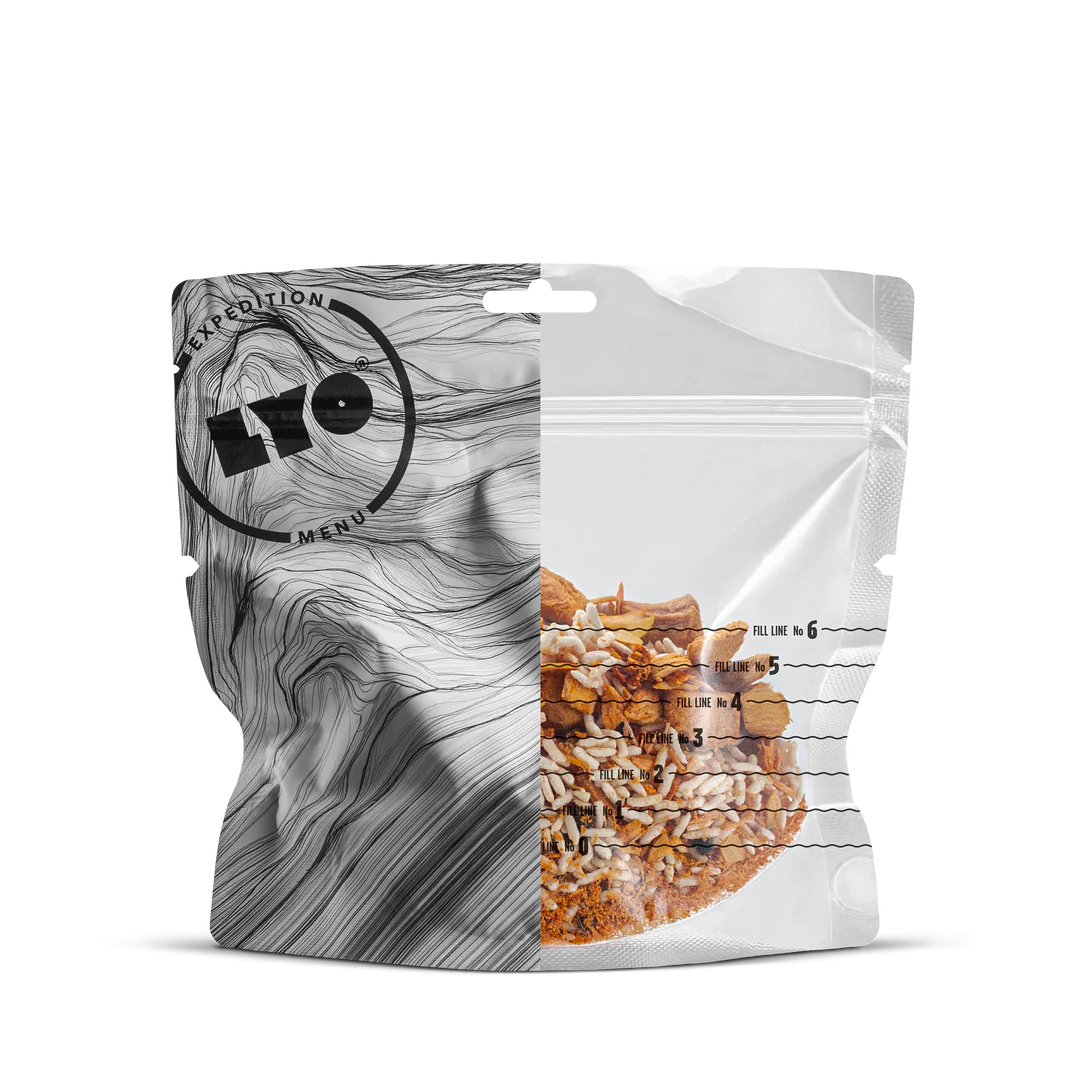 Лека и функционална опаковка: Опаковката е лека и удобна за приготвяне на LYO ястията директно вътре в нея.